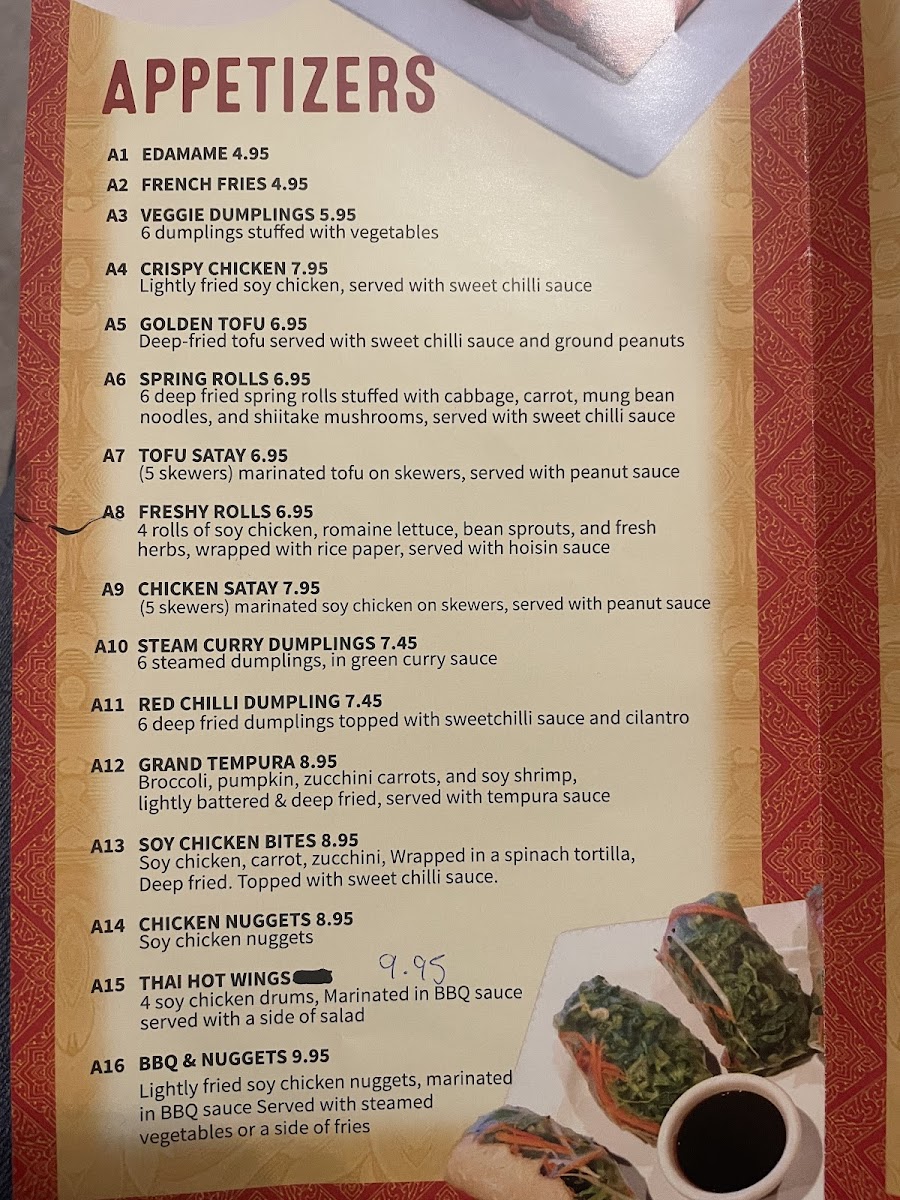 “ Vegan restaurant so food is a little different than what we were used to. The Tom Ka Kai was not as creamy but still very tasty. Ingredients were fresh and soup had a little kick/heat. The Red Curry was very hot and not sure if it could be toned down, but always easier to add heat. Clean restaurant and could use a little background music and some chop sticks. Had the Spring Roll appetizer which consisted of 6 portions freshly fried with a nice sweet, honey type sauce that tasted homemade. ”